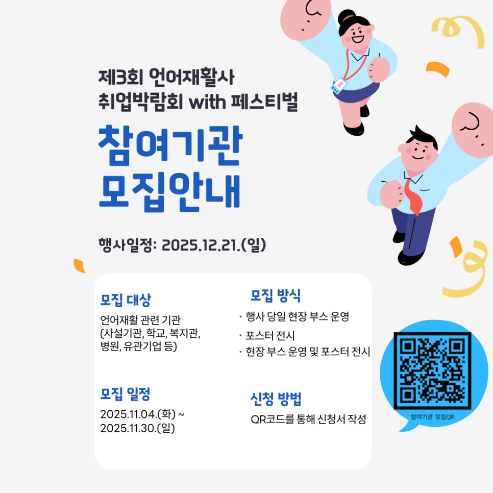 이번 취업 박람회는 다양한 직무정보와 체험부스 운영을 통해참여기관과 구직자 모두에게 실질적인 기회를 제공하고자 합니다.함께 성장하는 자리에 참여하시어 미래 인재들과 소중한 만남을 이어가시길 바랍니다.언어재활사의 꿈을 향한 첫걸음, 우수한 인재 발굴의 기회!제3회 언어재활사 취업박람회에서 함께 하세요.